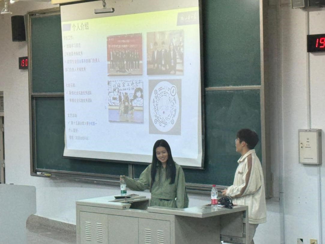 随着班会的序幕缓缓拉开,彭天鑫和王智民首先进行了简短的自我介绍,并分享了他们丰富多彩的大学生活经历。他们用“人生是旷野,而非轨道”的比喻,激励着在座的每一位新生,鼓励大家在大学的第一年勇于尝试,打破信息壁垒,寻找并确定自己的兴趣和目标,为之不懈努力。