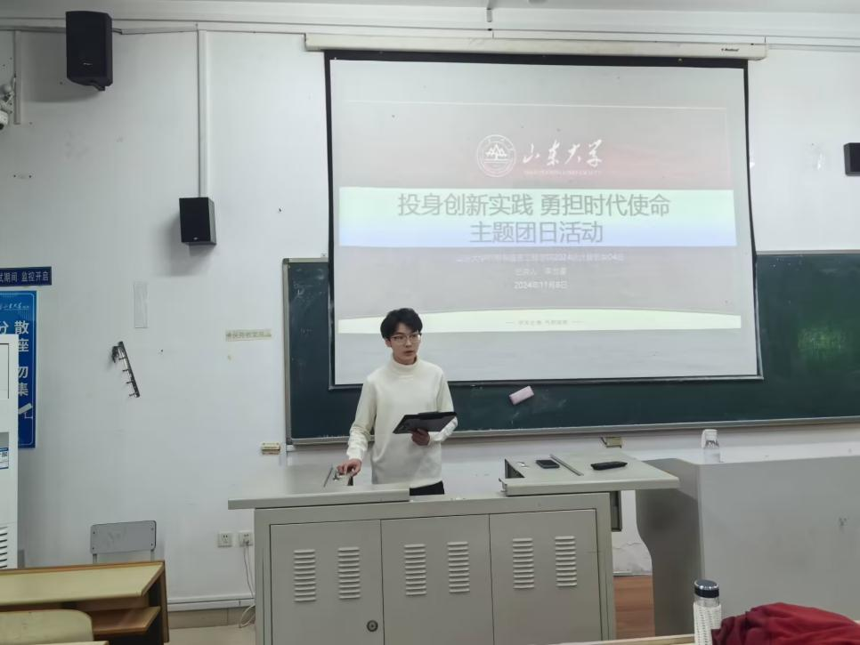 活动伊始,班长王景秋作为团员代表发言。他提到,在新时代,我们面临着前所未有的机遇与挑战,唯有坚持创新,方能立于不败之地。同时,创新必须根植于实践,要勇于尝试新思路、新方法。他还呼吁大家积极参与创新实践活动,不要妄自菲薄。同时,他还强调了团队合作的重要性,共同为担当家国责任、肩负国家民族未来而努力。