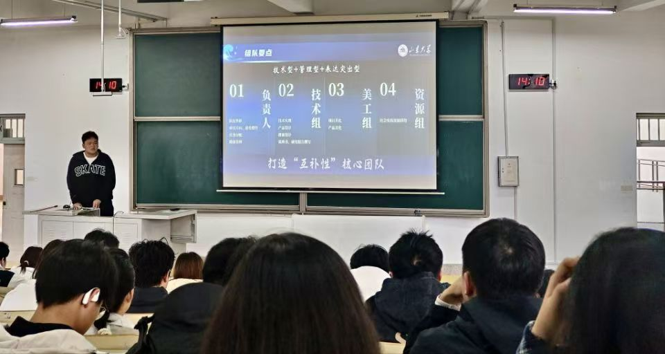 仪天宇则从“如何迈出第一步”入手,为初涉竞赛的同学们提供了清晰的方向指引与行动路径。他鼓励大家积极投身社会实践,从实践中汲取灵感,让产品在现实的土壤中生根发芽。现场,他还贴心分享了联系心仪导师的实用技巧,并围绕社会实践赛道与路演PPT制作等展开细致讲解,助力同学们提升项目设计与展示能力,为打造高质量竞赛作品奠定坚实基础。
