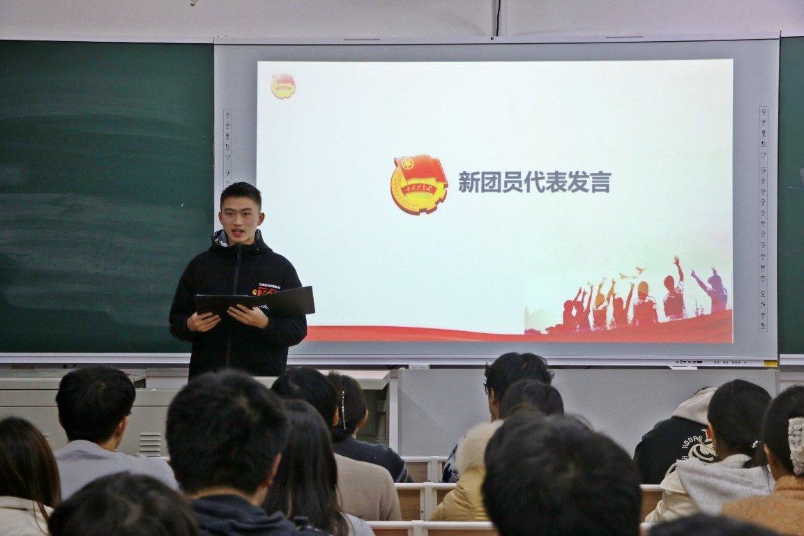 梁瀚文同学作为新团员代表登台发言,他倡议新团员们既以谦逊之心锤炼本领,又以满怀热忱投身团组织工作,以实际行动践行团员责任担当。