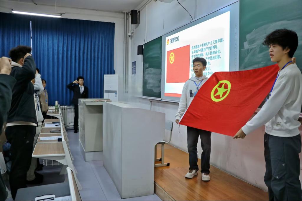 新发展团员们集体佩戴团徽,在领誓人李传玺的带领下,面向鲜红的团旗庄严宣誓,以铿锵有力的誓言表达了成为一名共青团员的责任与担当,更深刻地体现了他们为共产主义事业不懈奋斗的坚定决心与崇高信念。