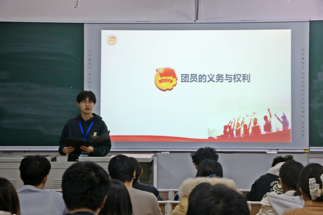 仪式进行中,组织部负责人赵宇晗逐字逐句宣读《中国共产主义青年团章程》中关于团员义务与权利的核心章节。字句铿锵有力,既传递出团员肩负的责任使命,也明晰了组织赋予的保障与权益,让在场团员在庄重氛围中深化身份认知、筑牢信仰根基。