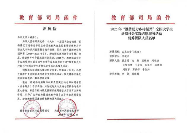 近日,教育部语言文字应用管理司与共青团中央青年发展部联合发来表扬信,表扬我院“华音同泽”团队在2025年“推普助力乡村振兴”全国大学生暑期社会实践志愿服务活动中为推广国家通用语言文字、服务乡村振兴战略做出了积极贡献。