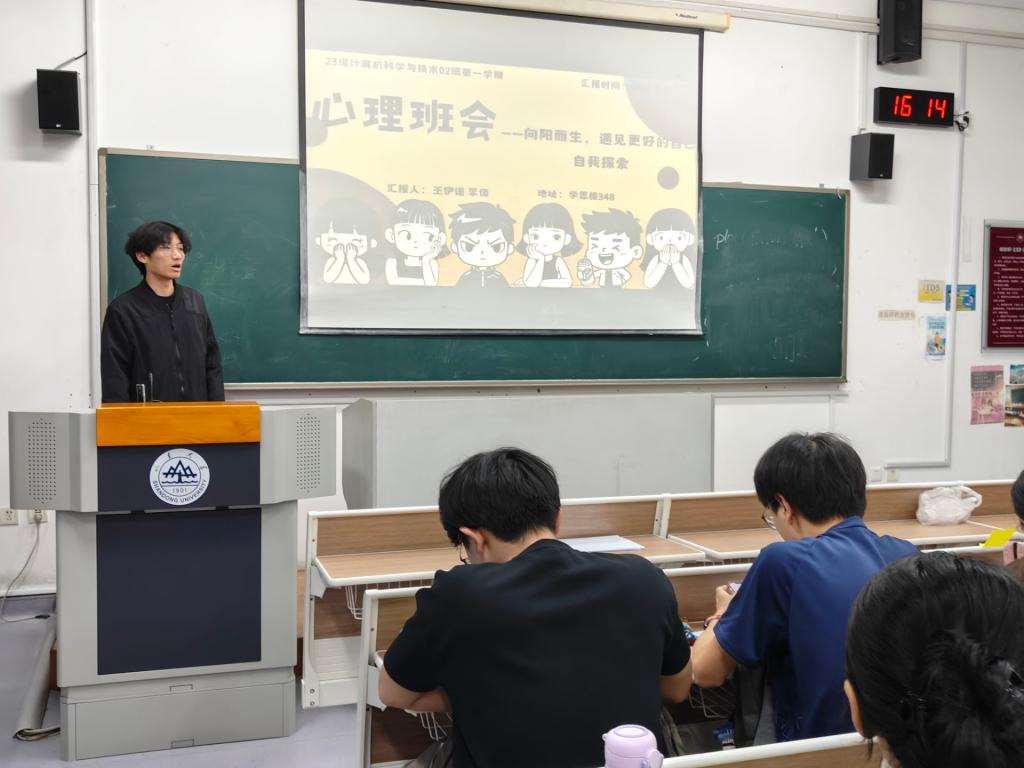 2025年11月10日,23级计算机科学与技术02班于学思楼348教室举办以“自我探索”为核心的心理班会。本次班会由王伊诺、李伋共同主持,通过理论分享、资源科普与正向引导相结合的形式,帮助同学们深化自我认知、明晰成长方向,营造了温暖包容的班级心理氛围,全班同学全程积极参与,收获颇丰。