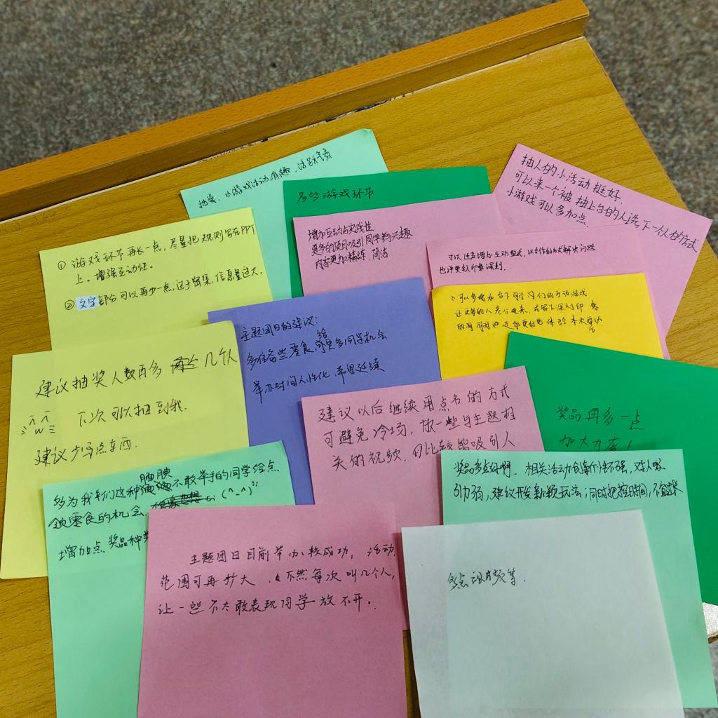 活动后期,在温馨而庄重的氛围中,同学们首先参与了 "时间胶囊" 活动,认真写下了自己的传承计划,郑重践行 "强国有我" 的青春誓言。紧接着,大家还在建议卡片上积极分享对本次主题团日活动的评价感悟,以及对后续活动形式和内容的期待建议。从大家的反馈来看,本次活动的趣味互动形式获得了广泛好评,同时也有同学提议后续可以增加红色户外实践、不同时期青年奋斗故事的视频分享等内容。这些鲜活而宝贵的想法,不仅体现了同学们的积极参与,更为团组织后续活动的提质增效提供了清晰的改进方向。