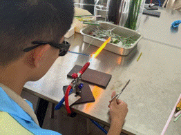 随后,团队成员来到融点琉璃文创店。在这里,调研团成员穿上隔热服,在技师指导下体验了琉璃捏塑的基础工序。技师介绍:琉璃以石英砂、纯碱、长石等为原料,经1280℃熔融后吹制或压制成型,再经数小时至数日退火与精修。同时,与技师的对话,让团队对行业困境有了更直观的认识:当前行业主要困于人才断层、原料与燃料成本上涨、机械化低价冲击。谈及非遗与文旅,技师认为颜神古镇改造带来客流与订单,既扩大传播亦反哺传承,但须警惕过度商业化稀释技艺本真。